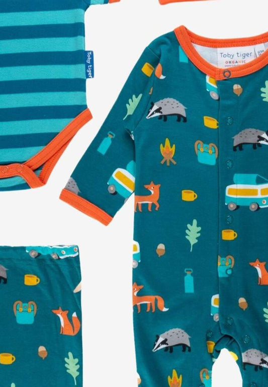 Organic cotton baby gift set with romper, hat and bodysuit with camper print