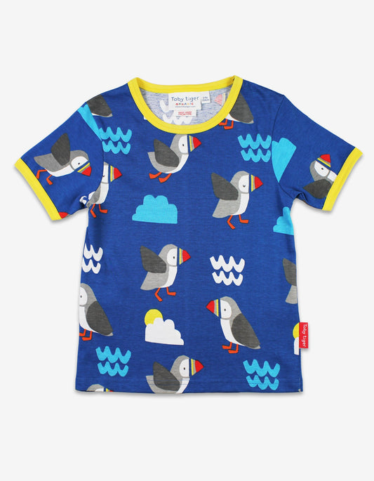 Organic cotton children's short-sleeved shirt with puffin appliqué