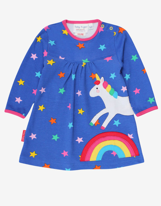 Organic cotton kids' jersey dress long sleeve with star print and unicorn appliqué