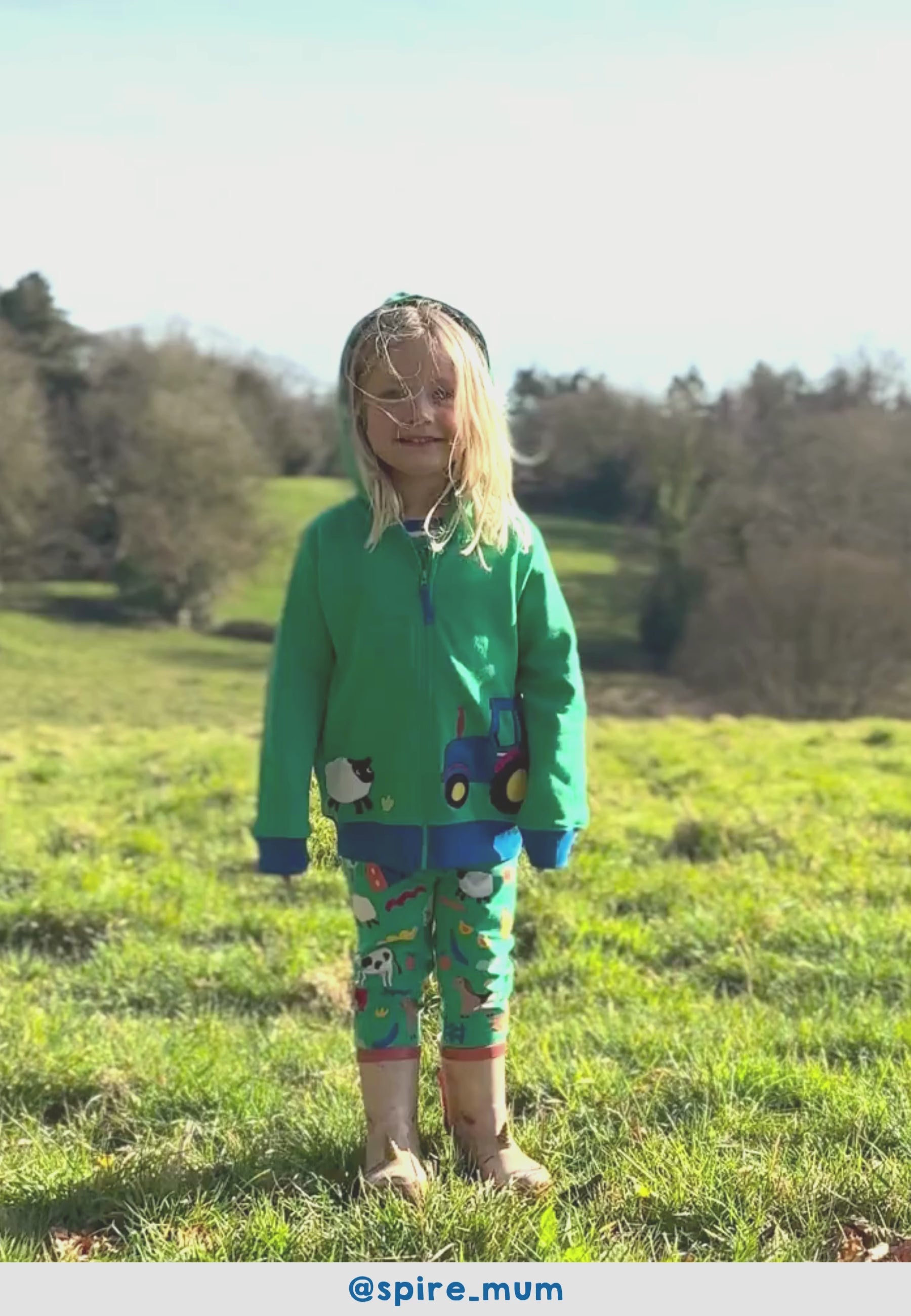 Organic cotton children's sweat jacket with hood and farm appliqué