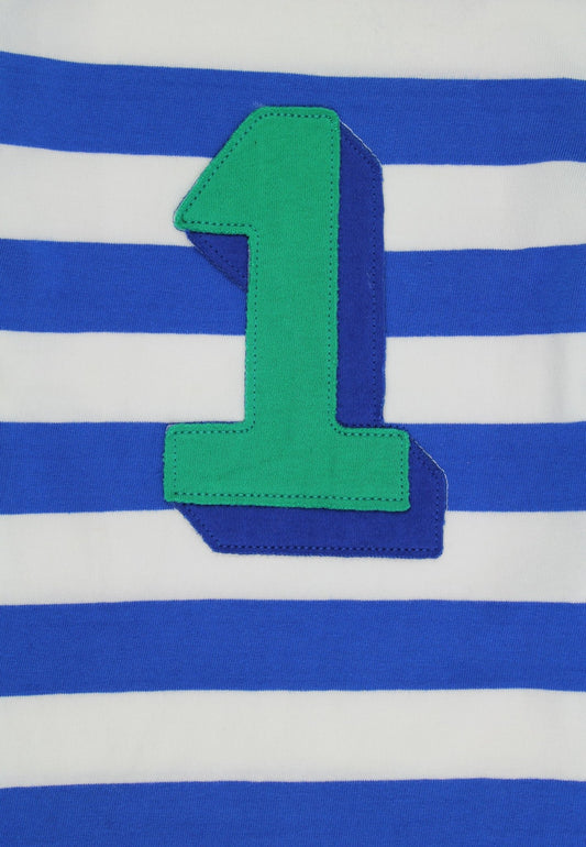 Bio-Baumwoll Kinder Langarmhirt blau-gestreift mit Eins-Applikation