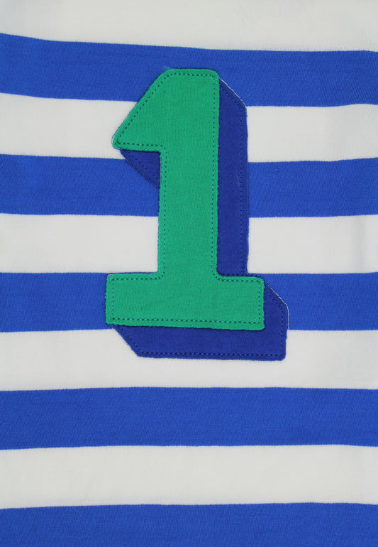 Bio-Baumwoll Kinder Langarmhirt blau-gestreift mit Eins-Applikation