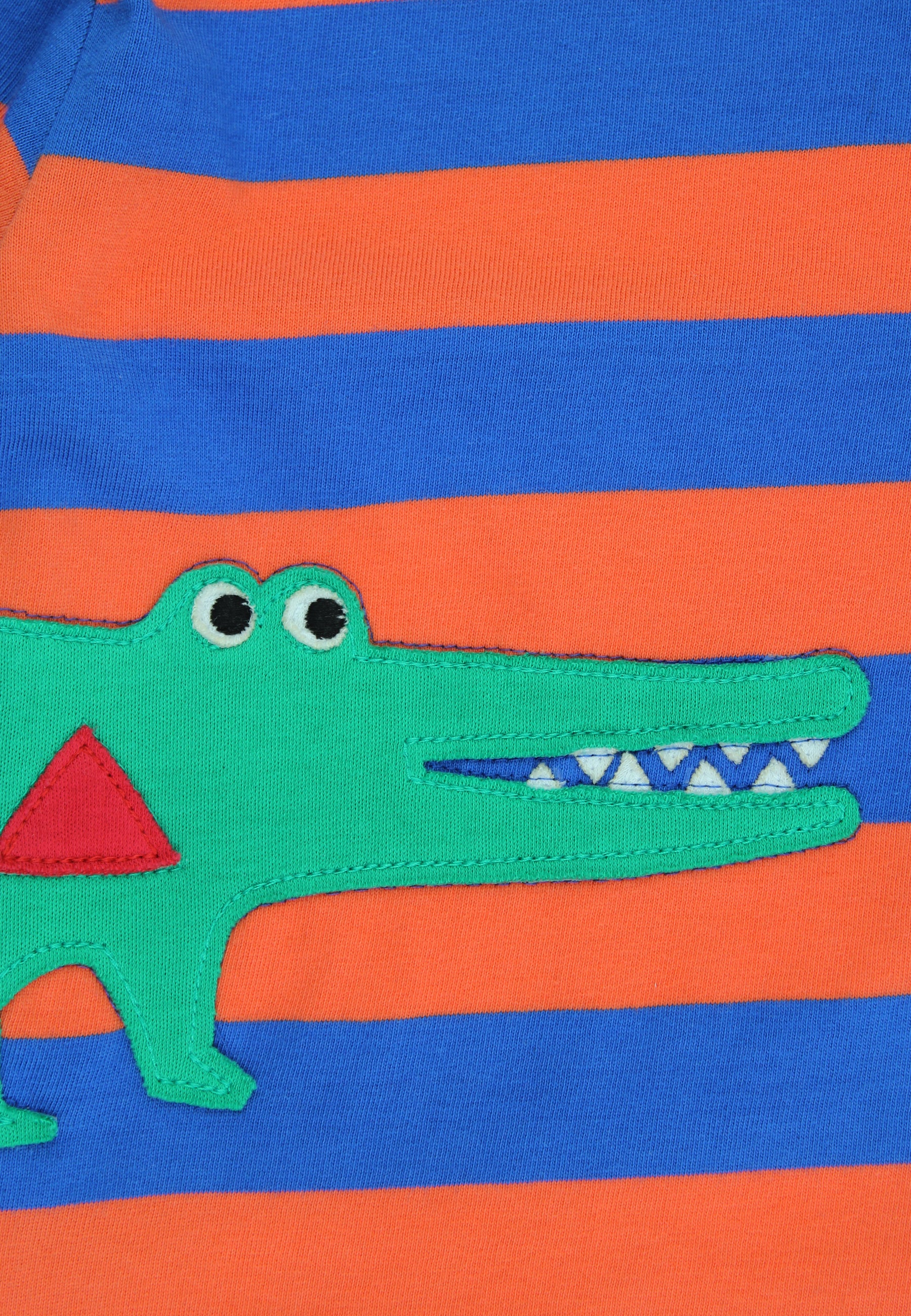 Unser Langarmshirt mit orange-blauen Streifen wird durch eine liebevoll gestaltete Krokodil-Applikation zum echten Highlight. Das fröhliche Krokodil mit seinen freundlichen Augen und dem verspielten Lächeln lädt zum Entdecken und Träumen ein – ein perfekter Begleiter für kleine Abenteurer.